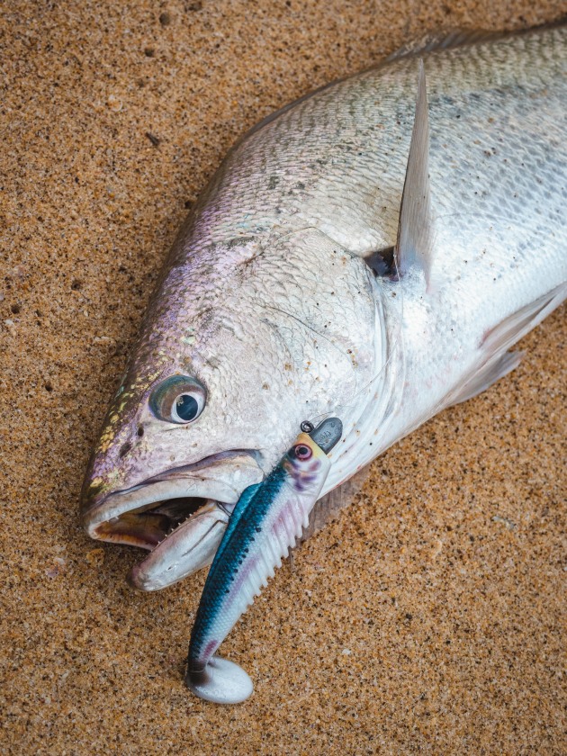 This lure will also swim straight and true with a conventional jig head. I like to use jigheads from 15-60grams (1/2-2oz) armed with a 7/0 hook. A slow roll or lift-drop-lift action works particularly well for jewies.