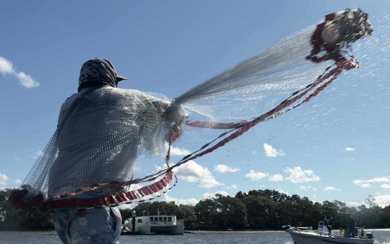 This isn’t too hard as you will see crowds of boats throwing cast nets from a considerable distance. One good throw can catch you up to 2 kilos of prawns or better. Most of these prawns are between 10 and 20cm long. Unlike a normal cast net used for catching mullet and other baitfish, a prawn cast net has a series of pockets up near the top of the net. The fish generally fall out the bottom whereas the prawns flick their way to the top of the net, being caught in the upper pockets. There is surprisingly little by-catch when using these nets.