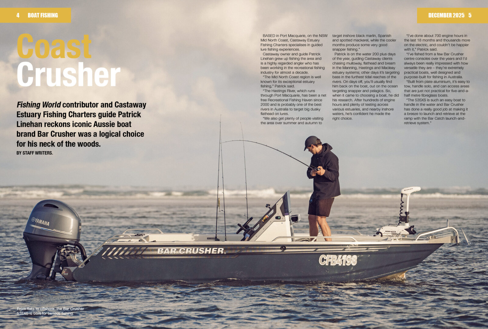 Fishing World contributor and Castaway Estuary Fishing Charters guide Patrick Linehan reckons iconic Aussie boat brand Bar Crusher was a logical choice for his neck
