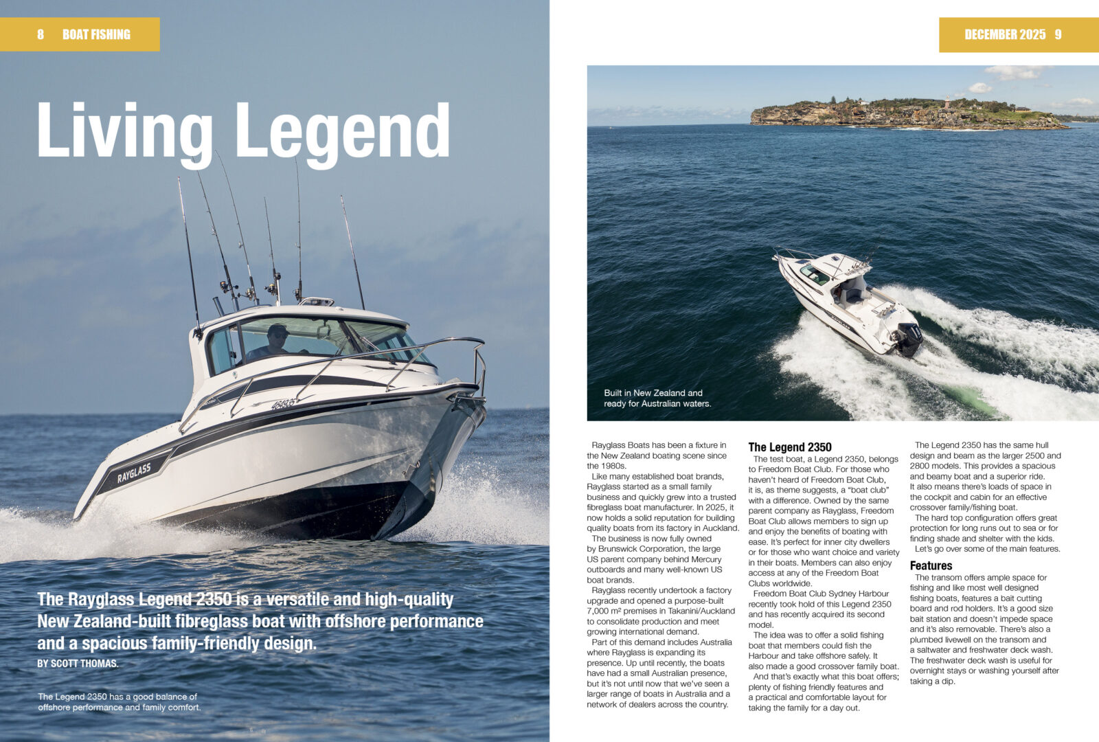 The Rayglass Legend 2350 is a versatile and high-quality New Zealand-built fibreglass boat with offshore performance and a spacious family-friendly design.