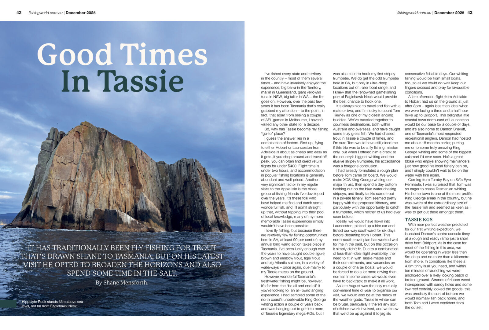 It has traditionally been fly fishing for trout that’s drawn Shane to Tasmania, but on his latest visit he opted to broaden the horizons and also spend some time in the salt.