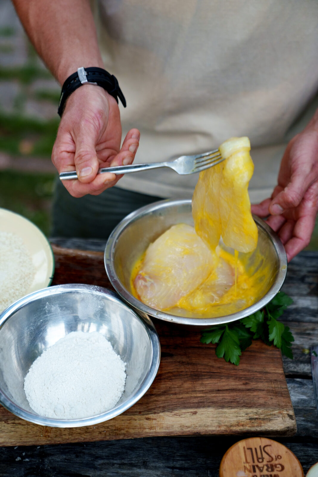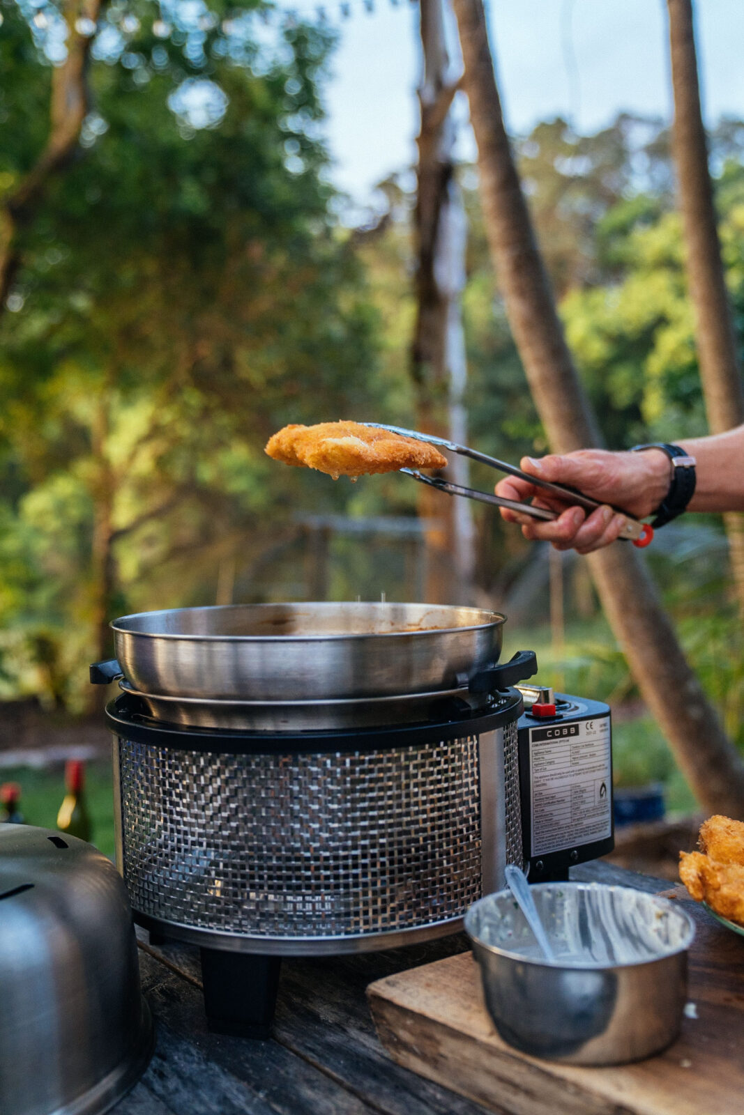 Fit the COBB Wok accessory, add enough oil for deep-frying, and preheat until it’s properly hot  (If a breadcrumb sizzles instantly, you’re good to go.)