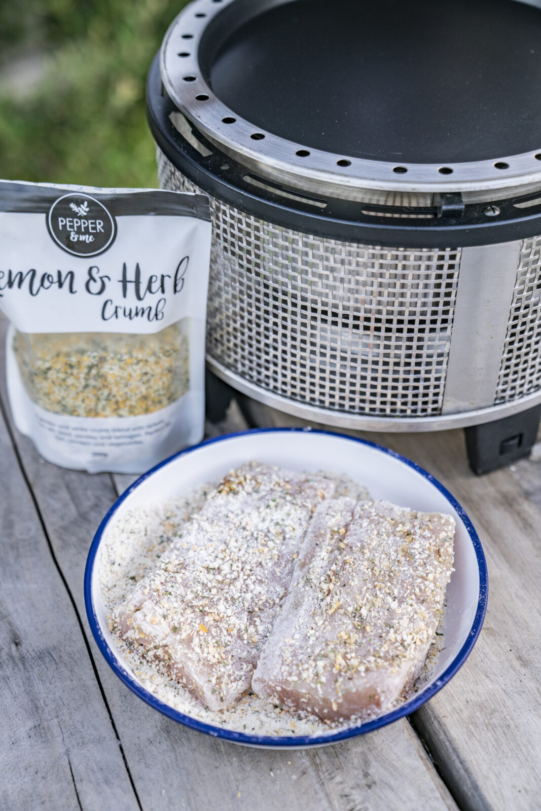 – In a plate, add some normal flour and a sprinkle of crumbs. We used Pepper & Me Lemon and Herb crumb into our flour for some extra flavouring.
