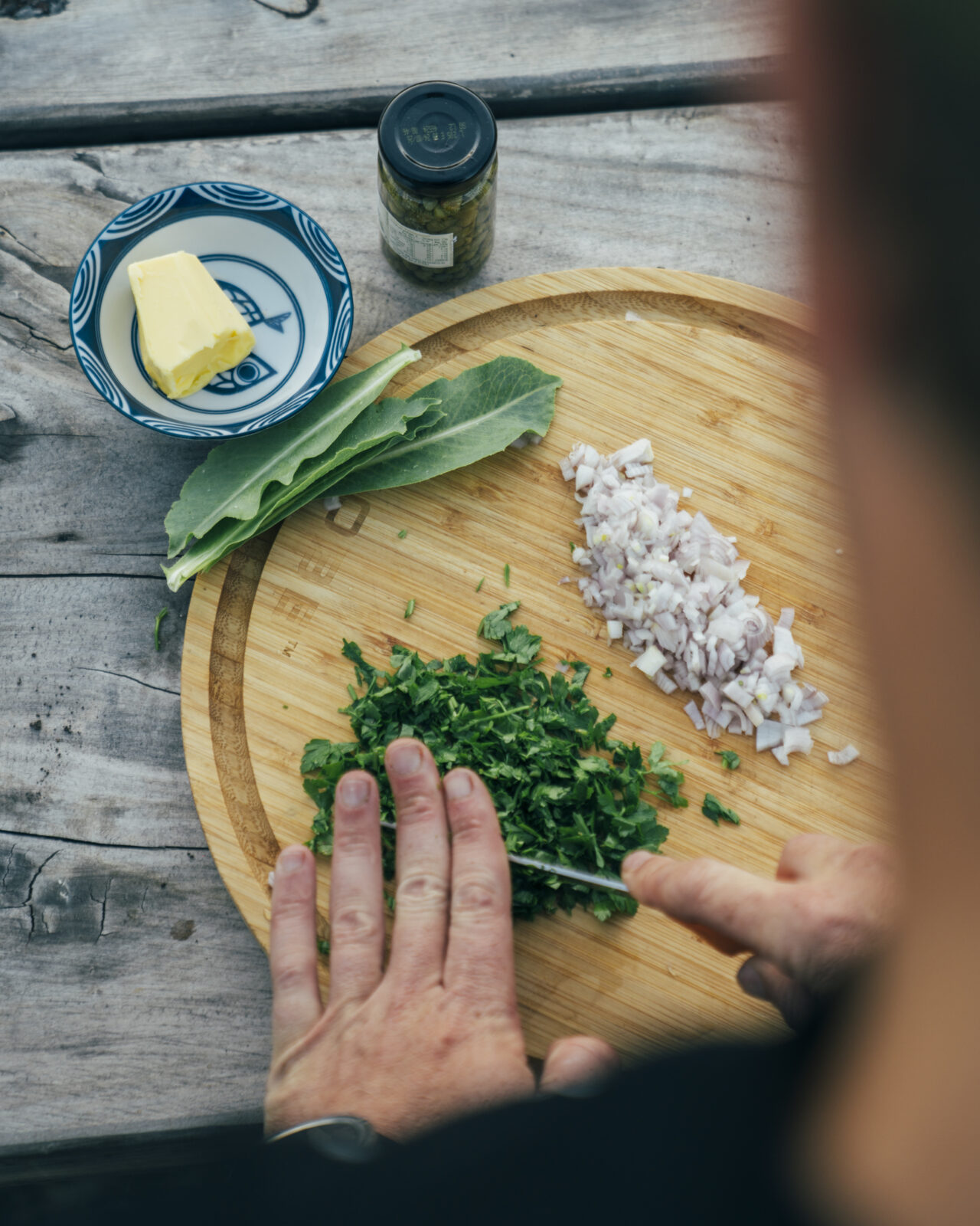 3.  Add the finely chopped capers and parsley into the reduced wine, shallot and butter mixture. Stir in the capers and add another 2 tablespoons of butter. Cook until the butter is melted and the sauce has thickened slightly. Season with salt and pepper and more lemon to taste.