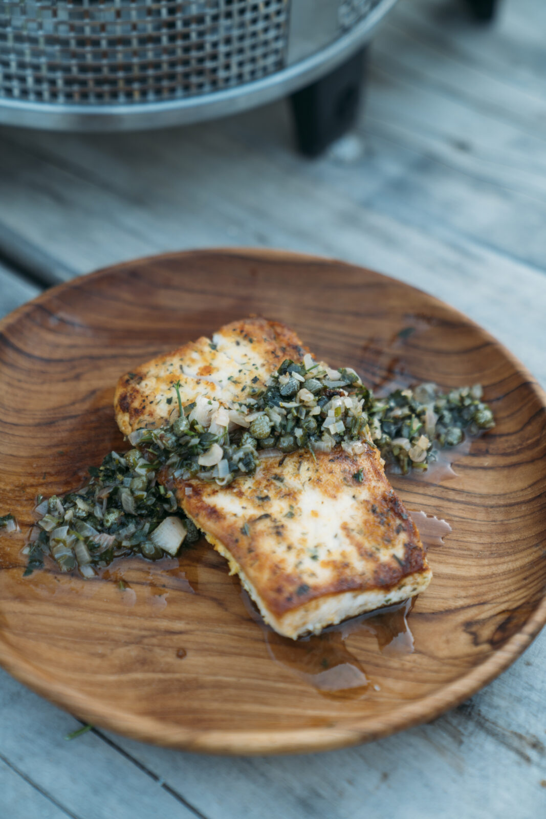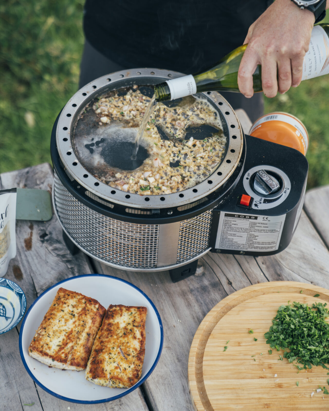 – Once the COBB Grill is ready, add some butter and olive into the pan. Place the fish steaks on the frying pan and cook for about 2 minutes on each side (depending on how thick your fish is) or until the fish is golden brown and cooked through. Carefully remove the fish from the grill and set aside on a warm plate.