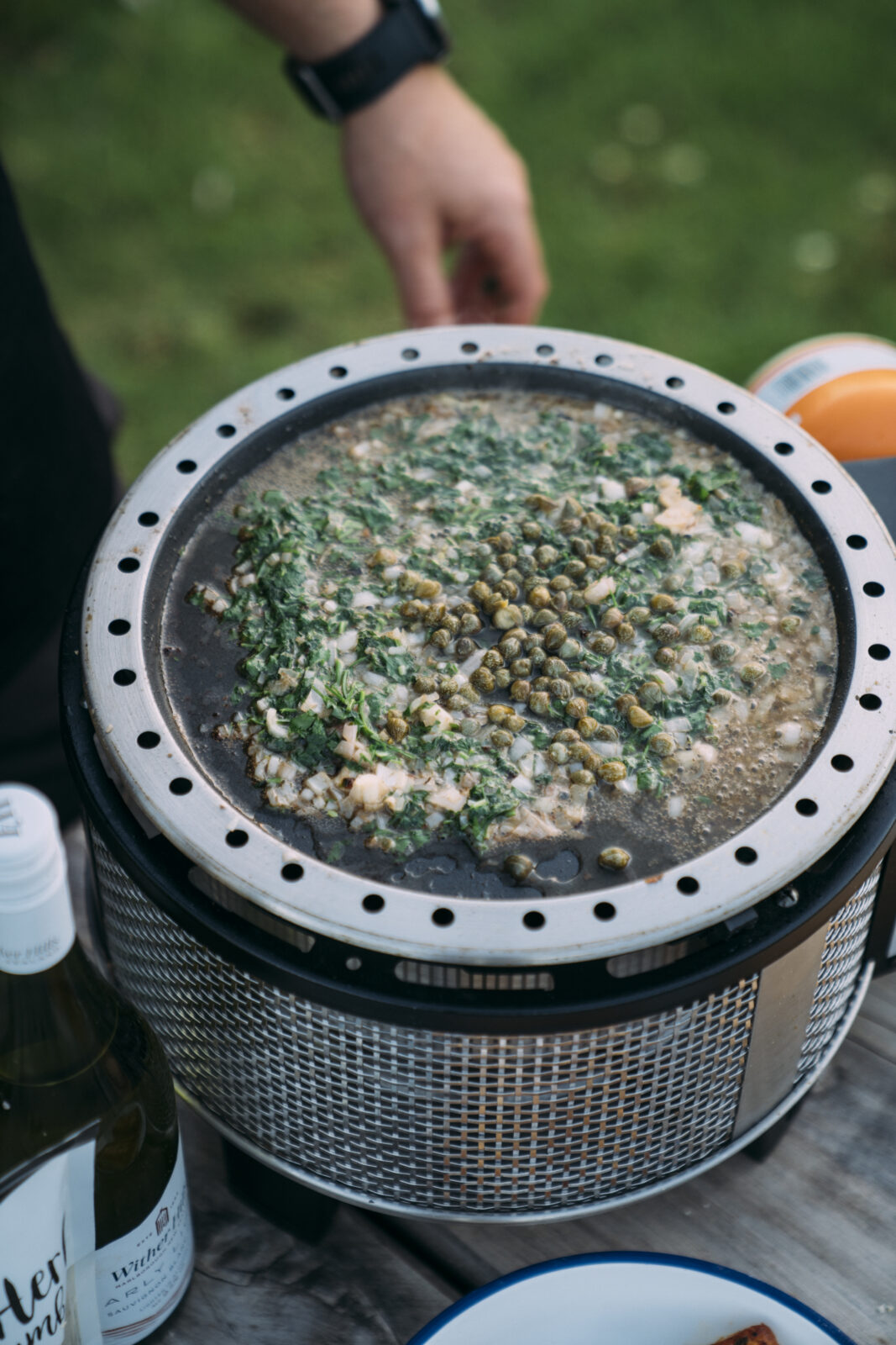 1. Once the fish has been removed from the COBB frying pan, add in a bunch of finely chopped shallots in the leftover butter and oil mixture on the COBB. Feel free to add another chunk of butter to make the piccata sauce nice a velvety.  Sauté until they become translucent, about 2-3 minutes.