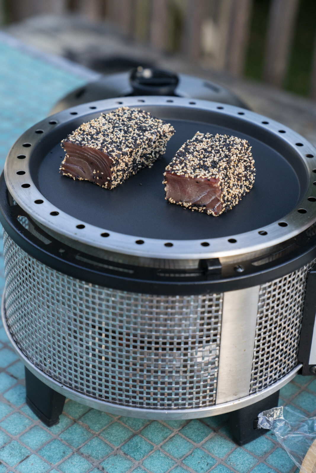 • Once all four sides have been lightly seared, remove from the COBB and place into the freezer for a few minutes so that it can harden up before slicing.