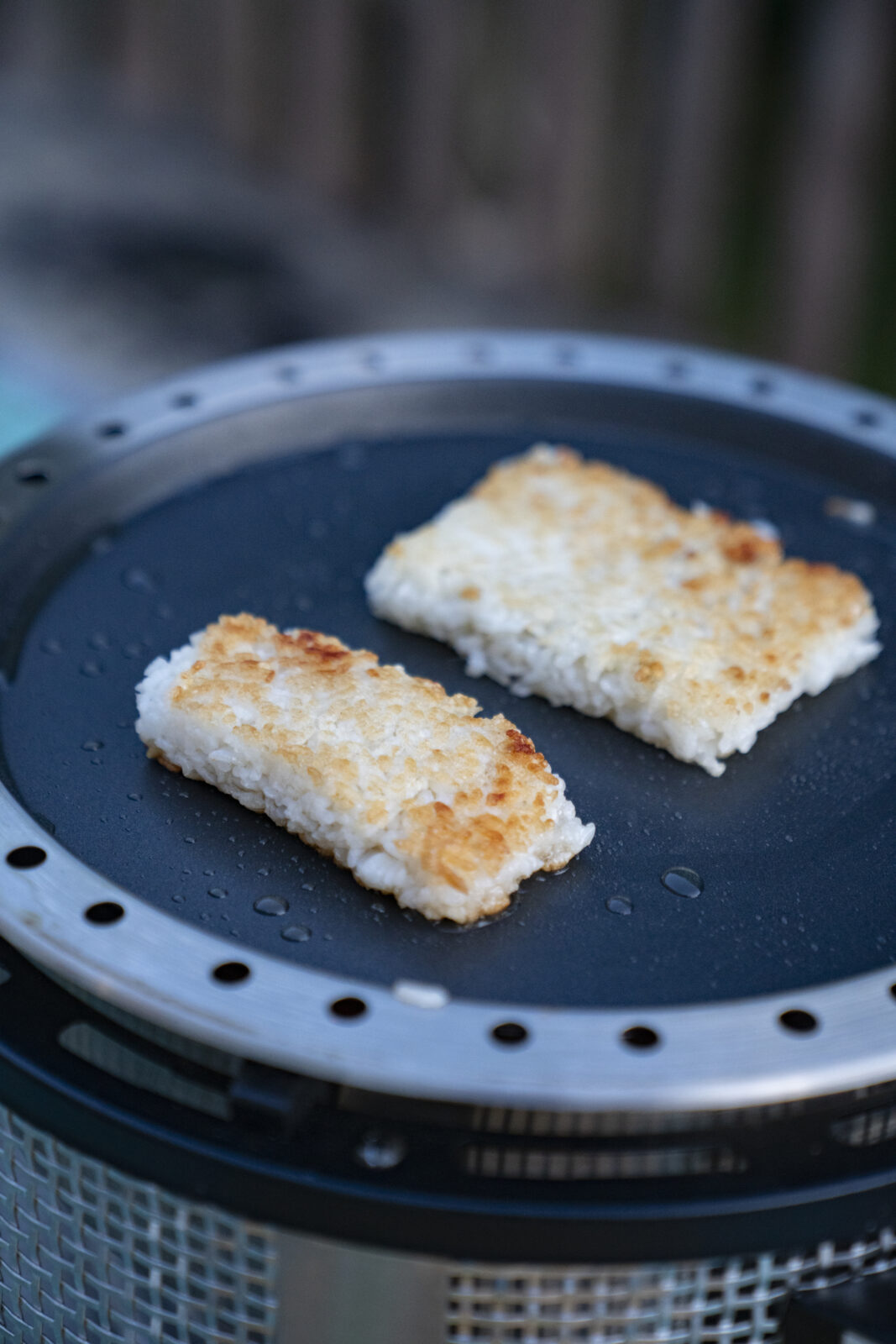 • Now that the fish is resting in the freezer, it’s time to fry up your rice squares.