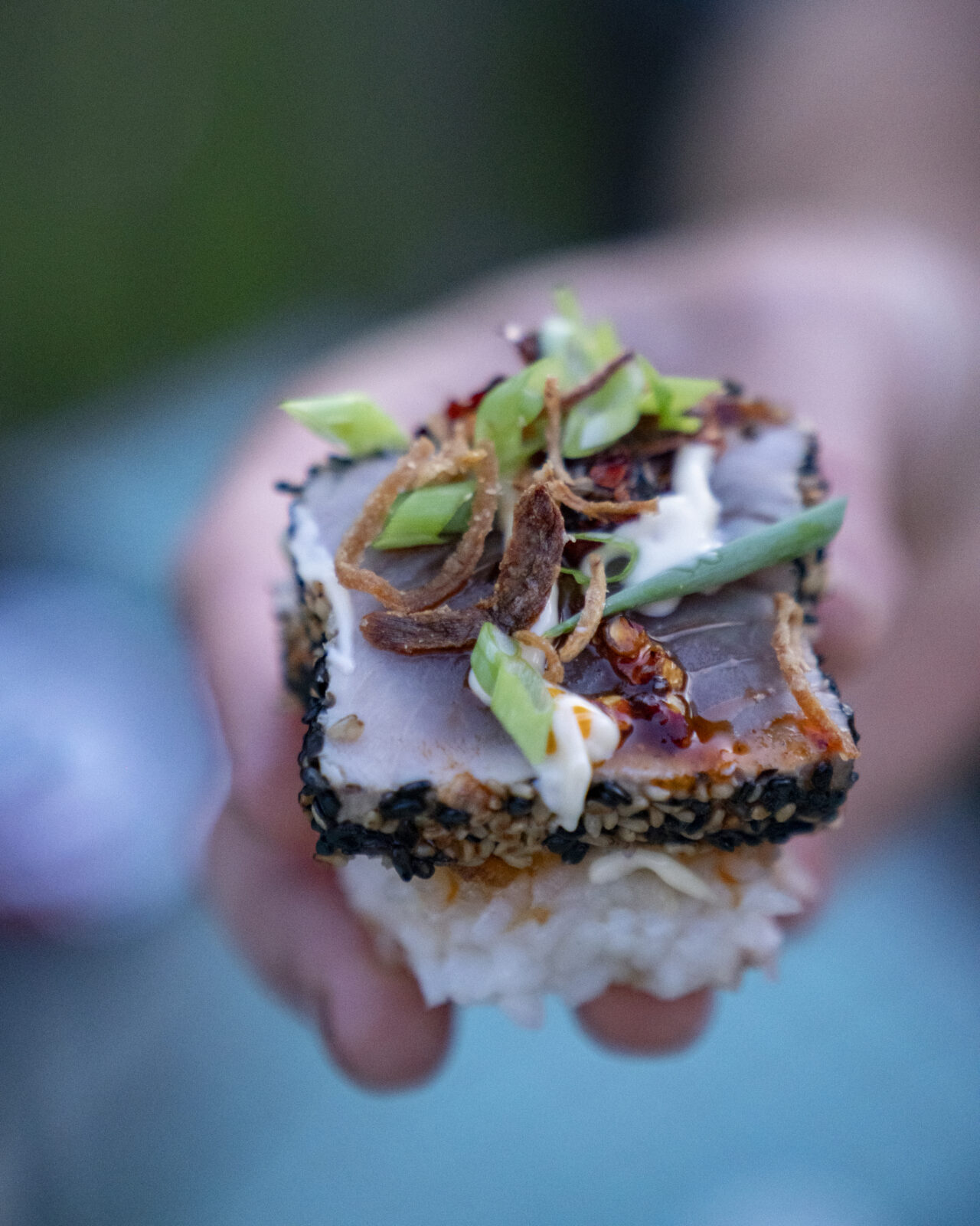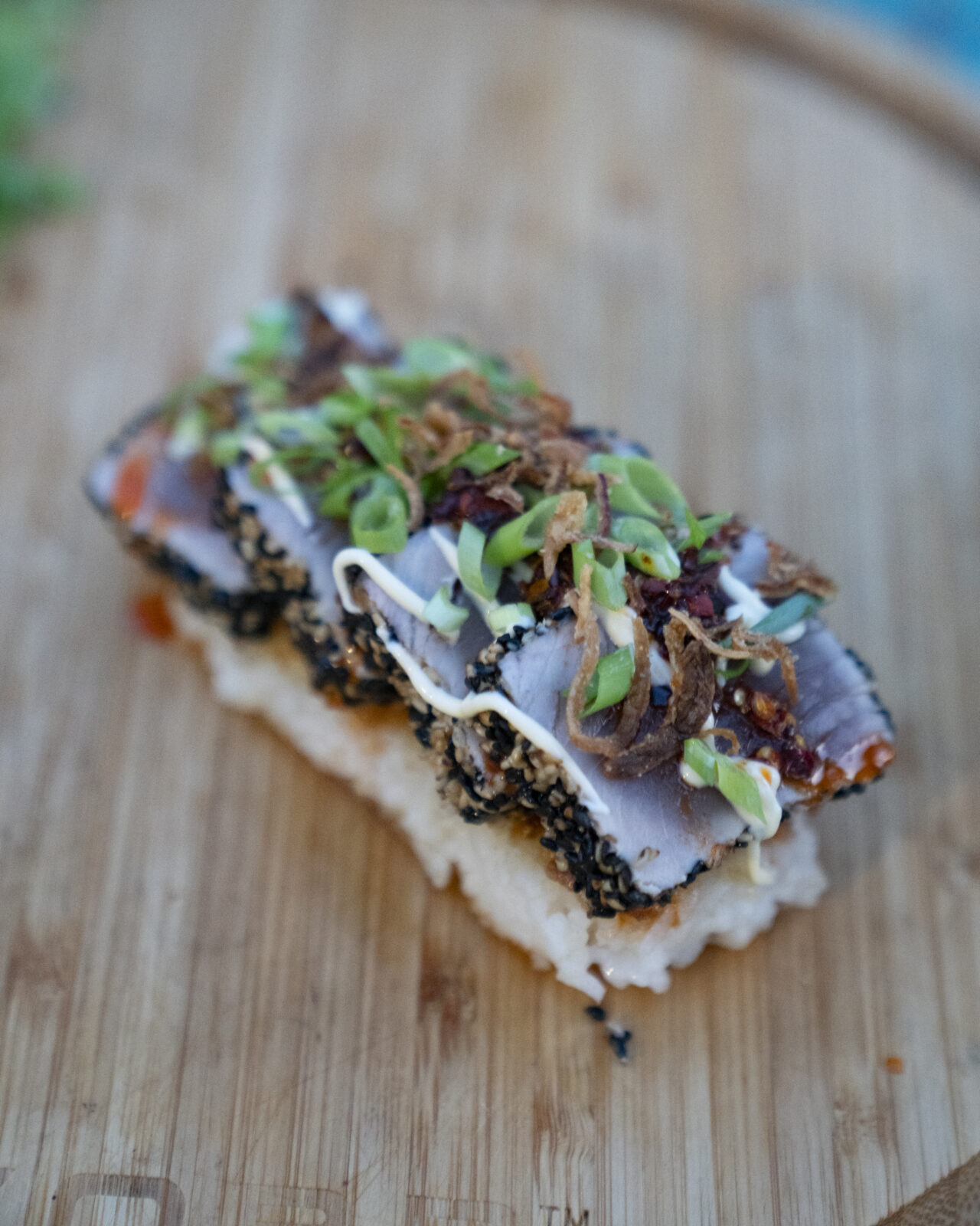 • Layer the sliced tuna tataki pieces on top of the cooled down crispy rice squares.